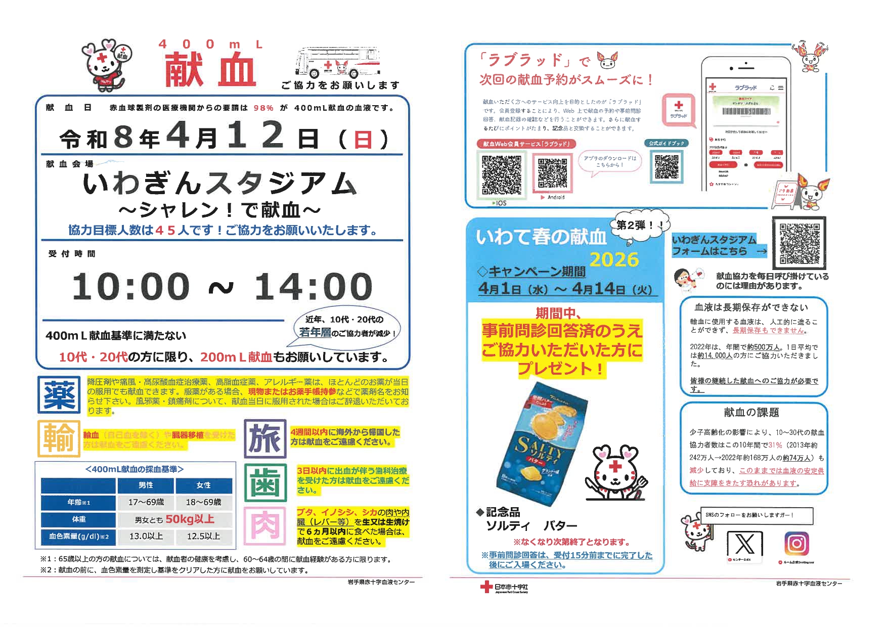 4月12日(日)、いわぎんスタジアム さくらストリート内に献血バスが出ます。
