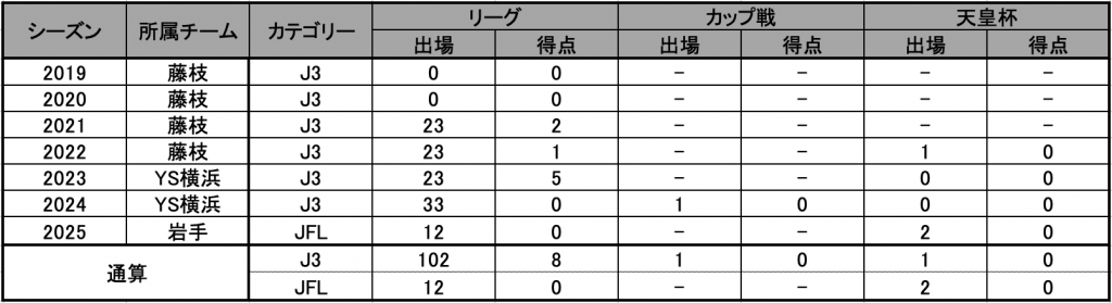 日生中央SC⇒ヴィッセル神戸伊丹U-15⇒ヴィッセル神戸U-18⇒大阪教育大⇒藤枝MYFC⇒Y.S.C.C.横浜⇒いわてグルージャ盛岡