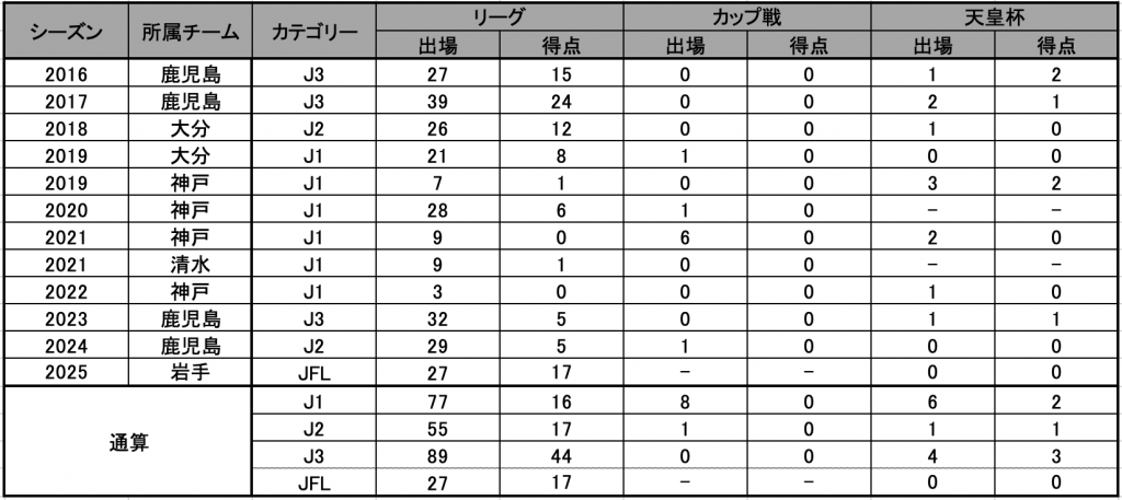 ガンバ大阪堺ジュニア⇒ガンバ大阪堺Jrユース⇒青森山田高⇒近畿大⇒佐川印刷SC⇒佐川印刷京都SC⇒SP京都FC⇒鹿児島ユナイテッドFC⇒大分トリニータ⇒ヴィッセル神戸⇒清水エスパルス⇒ヴィッセル神戸⇒鹿児島ユナイテッドFC⇒いわてグルージャ盛岡