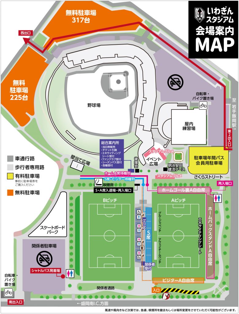 ※大型トラックなどの出入りが多く徒歩での移動は危険が多いため、ビッグプロ駐車場 ⇔ いわぎんスタジアム間は、往路復路ともに徒歩でのご移動はされず、必ずシャトルバスにご乗車ください。