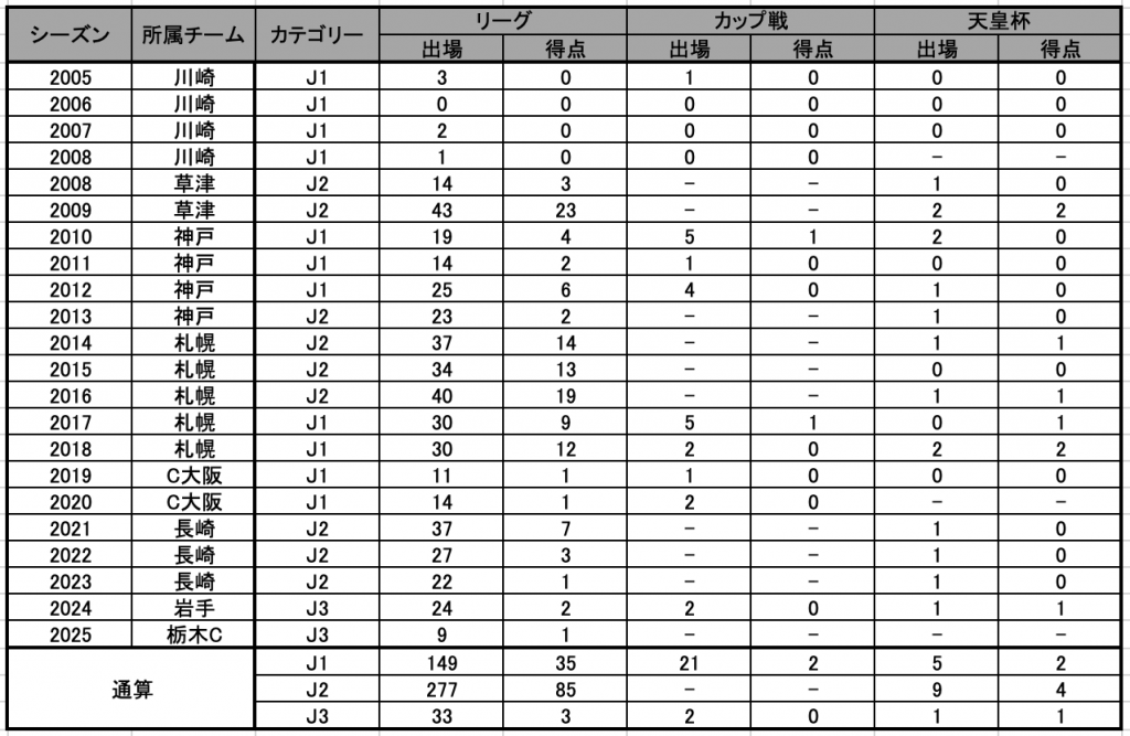 キンダー善光SC⇨横浜F・マリノスJrユース菅田⇨川崎フロンターレU-18⇨川崎フロンターレ⇨ザスパ草津⇨川崎フロンターレ⇨ザスパ草津⇨ヴィッセル神戸⇨北海道コンサドーレ札幌⇨セレッソ大阪⇨V・ファーレン長崎⇨いわてグルージャ盛岡⇨栃木シティ